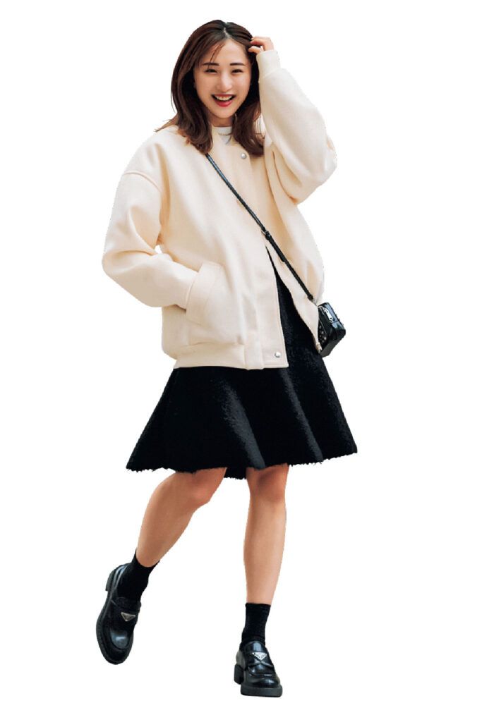 春の初めは急に冷え込むこともあるので、暖かくて軽いジャケットが大活躍。メンズライクなスタジャンにフレアミニを合わせることで、ボーイッシュでありながらも可愛らしさもキープしたコーデが完成しました。