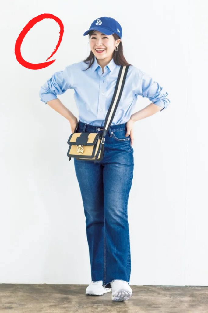 ぽっちゃりさんはオーバーサイズでごまかすより、ジャストサイズのシャツがスッキリ見え。さらに全体をブルーのワントーンに統一しつつ、キャップで目線を上げる効果も狙って。最後にクロスボディバッグでお腹回りをカバーしてしまう作戦!デニムパンツ¥9,460(Mila Owen)シャツ¥28,600(マルモア/DMC)バッグ¥82,500(ロンシャン/ロンシャン・ジャパン)スニーカー¥15,400(ナイキ スポーツウェア/NIKE カスタマーサービス)キャップ¥4,400(ニューエラ)ピアス¥13,200(ココシュニック オンキッチュ/ココシュニック)