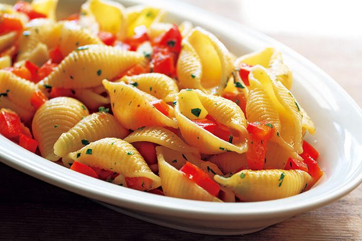 貝殻の形をしたモチッと食感のパスタ・コンキーリエを噛むと、よく絡んだパプリカの甘味が口いっぱいに広がります。最後の最後に加えるアンチョビの熟れた塩気がアクセントとして絶妙です。食べると元気になる野菜パスタを食文化研究家である北村光世さんに教えてもらいました。