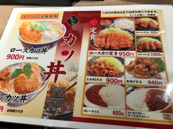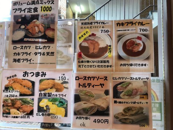 フライ定食・カキフライカレー・トルティーヤ・かつ丼等、ガッツリしたメニューばかりでした。ライスおかわり1杯まで無料です。