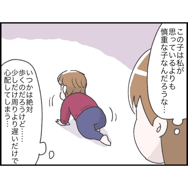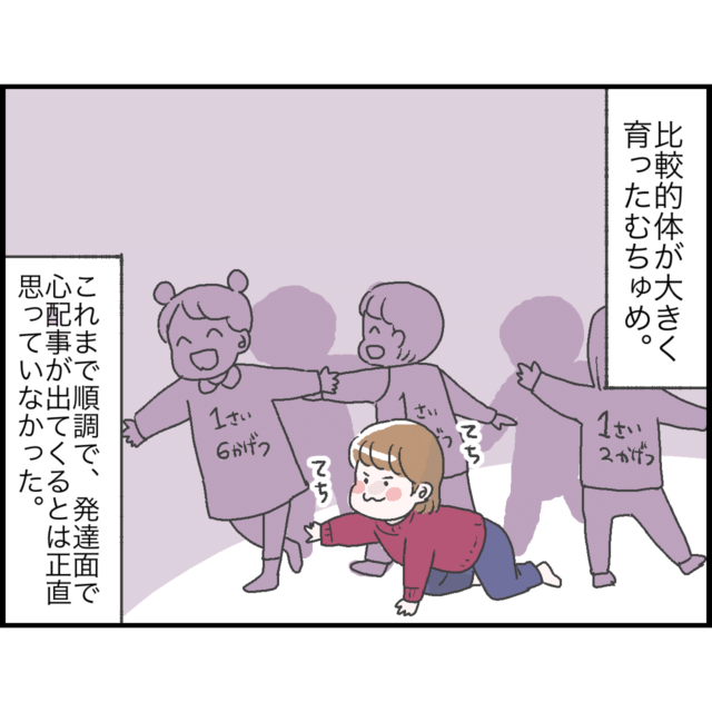 生後4ヶ月で寝返り、6ヶ月でずりばいとハイハイ、8ヶ月でつかまり立ちと、とても順調な発達だった娘ちゃん。しおさんは「一歳前には歩くかも」と思っていましたが、娘ちゃんは一歳三ヶ月になっても歩く気配はなく、器用に膝を使って移動するように。娘ちゃんが歩かないことを特に気にしていなかったしおさんですが、SNSや児童館などで他の子の成長を目にしていくうちに次第に周りの子と比べるようになり・・・。