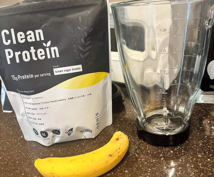 「前日に淹れておいた〈herbacie〉の『CLEANS』ハーブティーを飲んでカラダを温め、リセットした後に、〈GENiS〉のプロテインスムージーを飲みます。バナナとプロテインをオーツミルクで割り、サジージュースも入れ、ミキサーでブレンドするのが習慣です」