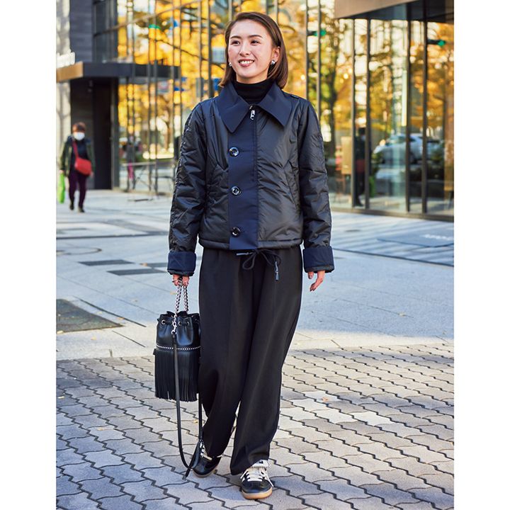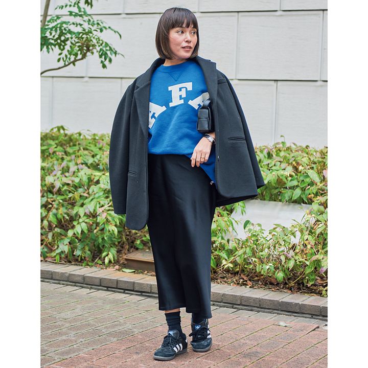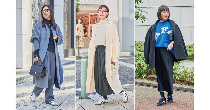 主張しすぎないから、スカートにもパンツにも合わせやすい。黒でもハードにならないスエード素材のサンバは特に冬に使いやすいです(山上さん)。普段からきれいめパンツが多いからレトロな雰囲気のサンバのおかげで頑張りすぎない印象に(戸田さん)。色が違うだけで見え方も変わるので、2足目もサンバをリピート(坂元さん)。