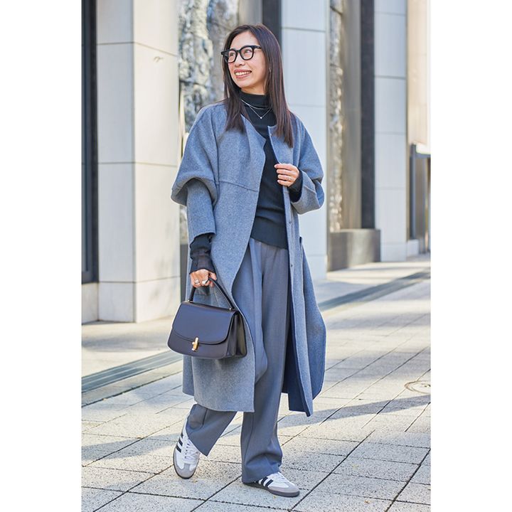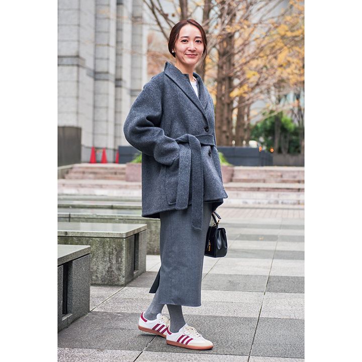 夏まで気分だったボリュームスニーカーよりも、サンバは上品に履けるから、冬のキレイめスタイルにぴったり。最近グレーコーデに注目していて、MACHATTのちょいゆるパンツからちらっと見えるサンバの3本ラインがさりげなくコーデのポイントになってくれます。