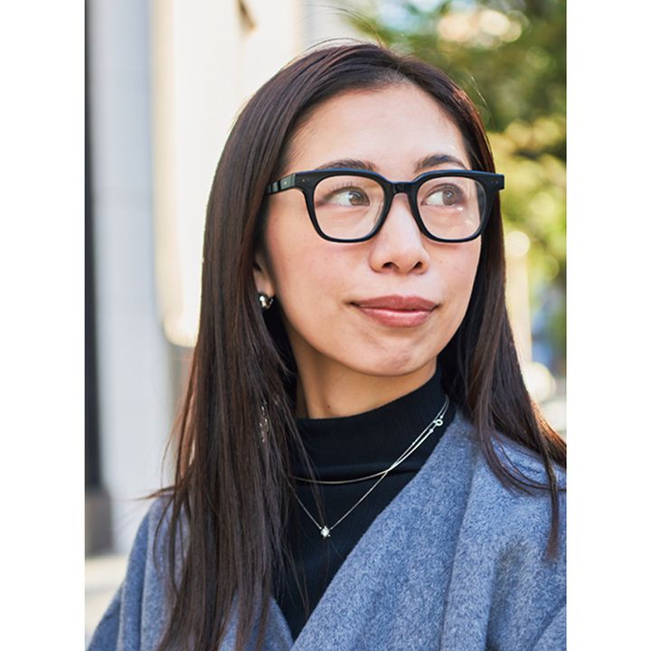 キレイめと相性のいい白サンバにはGENTLE MONSTERの黒縁メガネで全体がコンサバにならないように調整(戸田さん)。甘口なスカートコーデが苦手なので、Zoffの黒縁めがねが役立ちます(小西さん)。