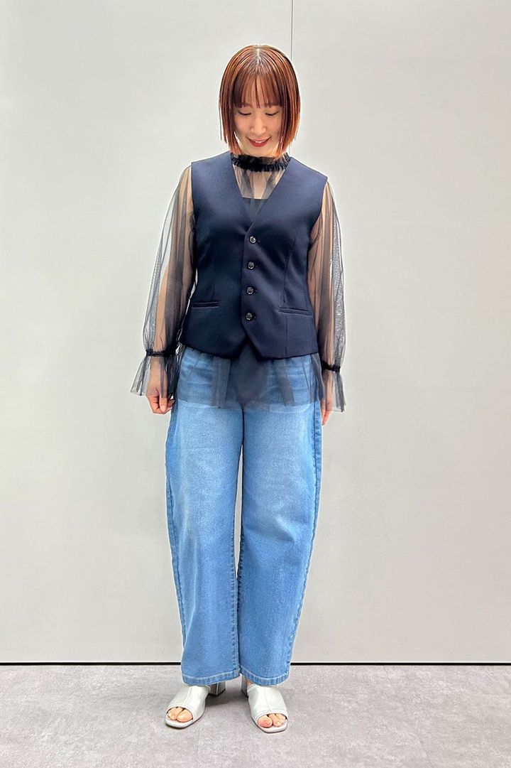 「シアーなブラウスにベストを重ね、レディ×マニッシュのミックススタイルに。独特なシルエットのデニムパンツなので、このような少しモードな組み合わせにも負けません。ベーシックなトップスを合わせてもサマになるので、いろんな着こなしを楽しんでいただきたいです!」