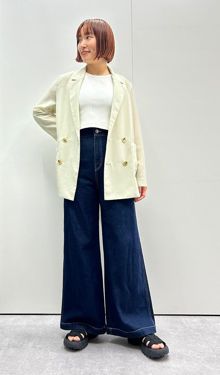 「今年は、シアーなアイテムとのコーディネートがイチ押しです! たとえば、ほんのり透け感があるジャケットを合わせたきれいめスタイル。このデニムは、少しフレアがかったワイドシルエットなので、はくだけで脚長になれますが、クロップド丈のタンクトップを選ぶと、よりその効果を発揮してくれます」