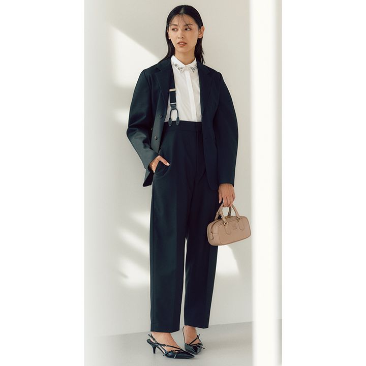 ストラップパンプス¥181,500 バッグ¥341,000※ともに予定価格(ともにミュウミュウ/ミュウミュウ クライアントサービス)ジャケット¥63,800 サスペンダーパンツ¥35,200(ともにロエフ/エイチ ビューティー&ユース)ビジューシャツ¥24,200(ユナイテッドアローズ/ユナイテッドアローズ 六本木ヒルズ店)