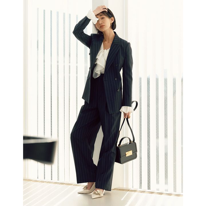 パンプス¥139,700 バッグ¥311,300(ともにジミー チュウ)ストライプジャケット¥59,400 パンツ¥39,600(ともにエストネーション)カシュクールブラウス¥30,800(ヘリテノーム/ガリャルダガランテ 青山店)ピアス¥70,400(オー/ハルミ ショールーム)リング¥6,600(ロニ)