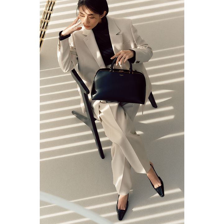 パンプス¥159,500 バッグ¥462,000(ともにサンローラン バイ アンソニー・ヴァカレロ/サンローラン クライアントサービス)ジャケット¥83,600 タックパンツ¥53,900(ともにエブール/エブール GINZA SIX店)シアートップス¥14,300(ランバン オン ブルー/レリアン)