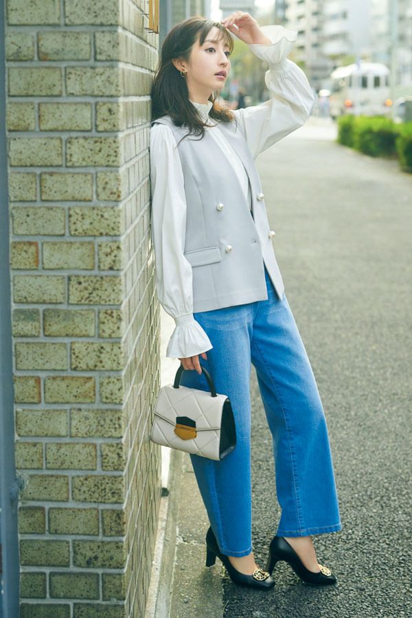 カーブデニムパンツ¥6,039/ロペピクニック ジレ¥8,800/MISCH MASCH(ダブルエー) ブラウス¥16,500/ダブルスタンダードクロージング(フィルム) バッグ¥13,900/CHARLES & KEITH イヤリング¥6,820/イットアトリエ(14 SHO WROOM) パンプス¥25,300/タラントン by ダイアナ(ダイアナ 銀座本店)