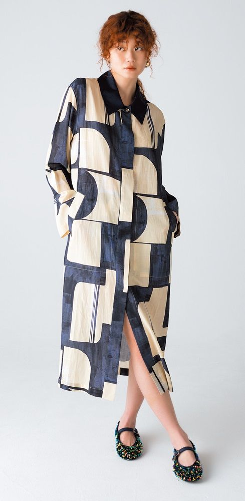 抽象的なモチーフを不均等に重ねたプリントに、サテンの大きな衿が引き締め役。ワンピースとして着るのはもちろん、ドロップショルダーのゆったりとしたシルエットでスプリングコートとしても活躍。¥93,500(イン/ショールーム リンクス) シューズ¥17,600(オデット エ オディール/オデット エ オディール 新宿店 TEL:03・5324・5080) ピアス¥22,000(マユ/マユ ショウルーム kohcoon@mayuokamatsu.com)