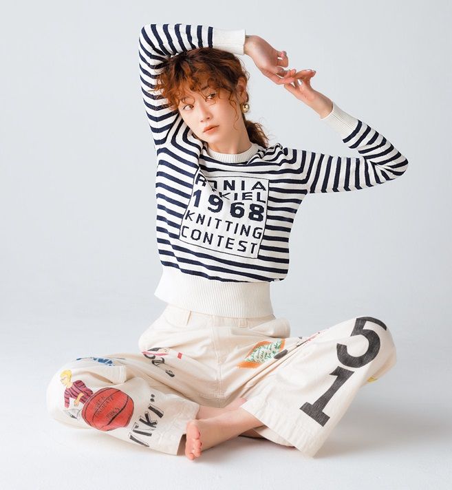 ブランドロゴが目を引くニットはコンパクトなサイズ感もキュート。ネイビーは直営店と『エストネーション』のエクスクルーシブカラー。¥69,300(ソニア リキエル/エストネーション グランフロント大阪店)