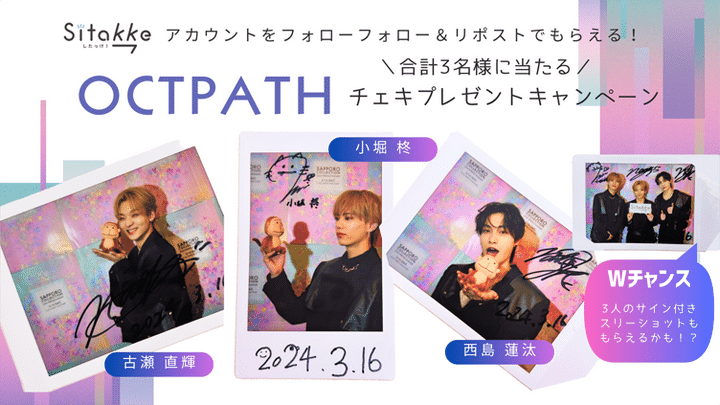 OCTPATHメンバー、古瀬 直輝(こせ・なおき)さんと、小堀柊(こぼり・しゅう)さん、西島蓮汰(にしじま・れんた)さんの直筆サイン入りチェキを抽選で3名さまにプレゼント!3名さまのうち、1名には、古瀬さん、小堀さん、西島さんのサイン付きスリーショットも当たります!