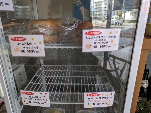 お昼前にはサンドイッチも揃います。パンはドイツパンで有名な、サイラー(福岡市南区)のカイザーゼンメルなどを使っていますので、本場の味が楽しめますよ。ポテトサラダやザワークラウトもありました。