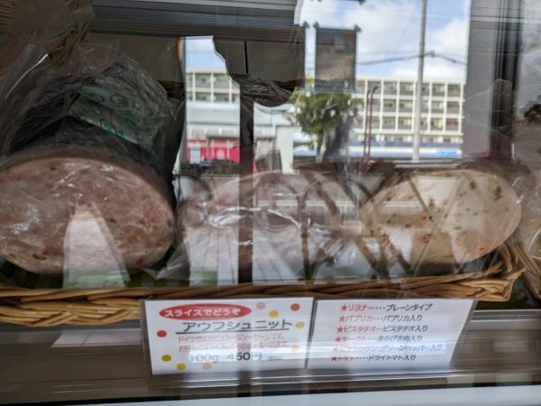 こちらの店舗の奥は工房になっていて、大きなスモークマシーンもありました。大きなお肉を次々と調理していくオーナーさんの後姿は、正に職人です! 早速商品を見てみましょう。 ドイツでポピュラーなアウフシュニット。スライスしてもらったらそのまま食べられるタイプです。