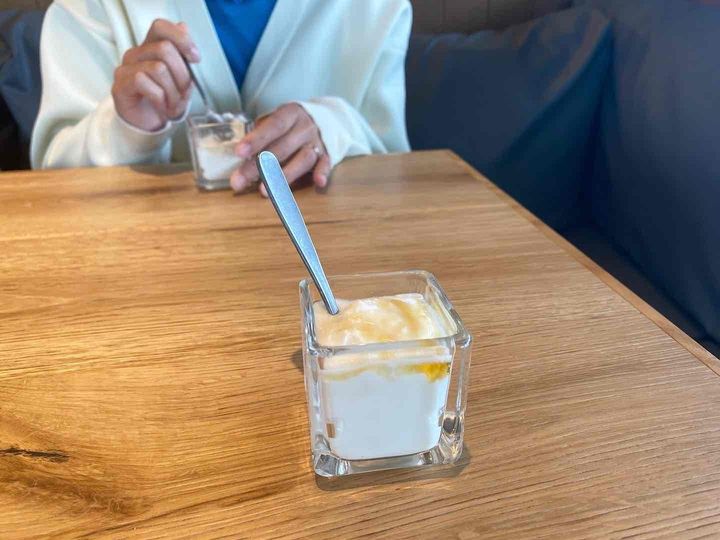 もちーっとした求肥(ぎゅうひ)のおもち部分はとてもやわらかくて、パンケーキと一緒にするするナイフが通りました。ふわふわのパンケーキとクリーム、もちもちのおもちが出会い口の中で溶けるような食感……♡