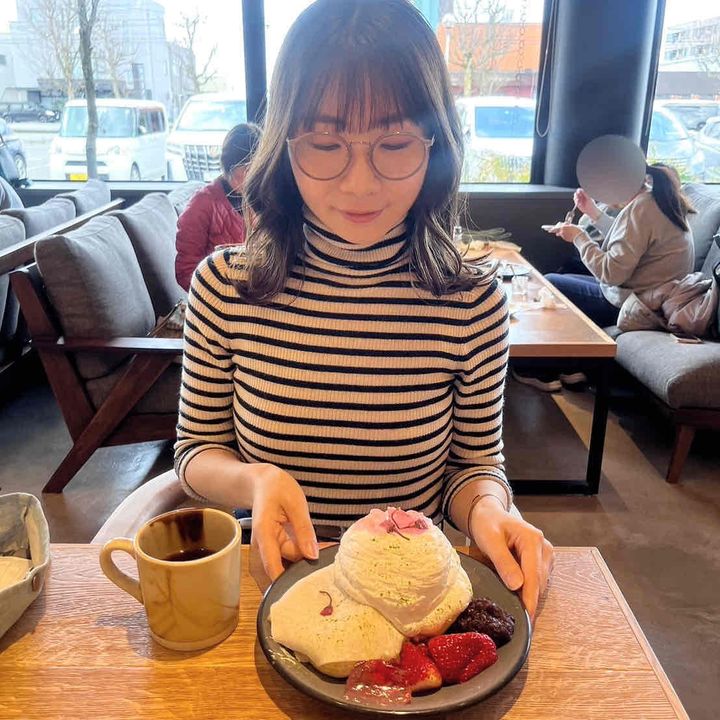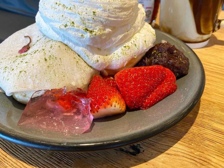 パンケーキに添えられた大きないちごやあんこ、クリームの中に隠れている桜風味のアイスクリームなど、一度にさまざまな味が楽しめる甘いもの好きの心を掴むスイーツだと感じました!