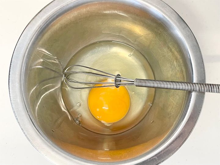 1.  卵は白身の部分をほぐします。