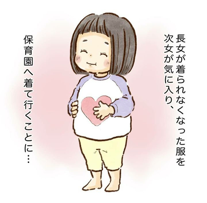 おさがりはなんとなく、下の子としては不満かな?と思っていたのですが…お姉ちゃんが着ていた服を着られるのが嬉しいんだなと、ほっこりしました。
