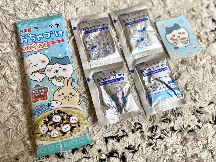 お茶漬けを食べている表情が愛くるしい! 1袋に4袋入っています。個包装の柄もちいかわデザイン。ランダムで、オリジナルキラキラシールが1枚イン。