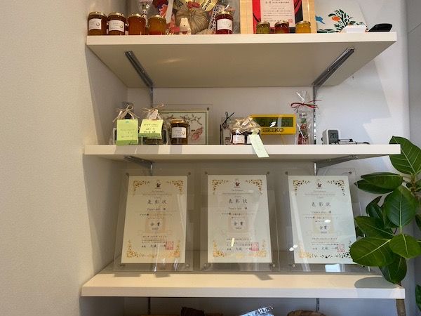 レジカウンターの向こうの棚には数々の賞状が並んでいます。『ダルメイン ワールド マーマレード アワード 2024 』というマーマレードのイギリス世界大会のアルチザン部門で、柚子マーマレード、夏みかんマーマレードの2品、金賞受賞という素晴らしい成績を収めたそうです!!!4月にイギリスで表彰式があるそうで渡英するとのことです!!!