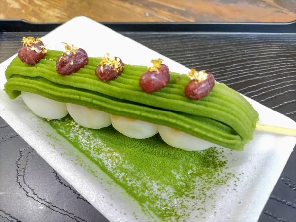 河越抹茶の風味を存分に味わえる抹茶あんの上に、小豆が整然と並び、金粉が華やかにトッピングされています。河越抹茶と餡の調和が絶妙で抹茶好きには、たまらない逸品です。