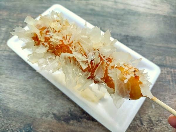 地元乾物店のこだわり削り節を使った『BUSHIだんご』は、鰹と鶏の2種類から選べます。おすすめは、めずらしい鶏削り節!醤油と鶏削り節の風味、塩気のある焼きだんごは、やみつきになる美味しさ。日本人は、みんな大好きな味かも!