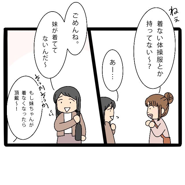 着ない体操服を持っていないか聞いてみたら、お下がりは妹さんが着ているのだそう。