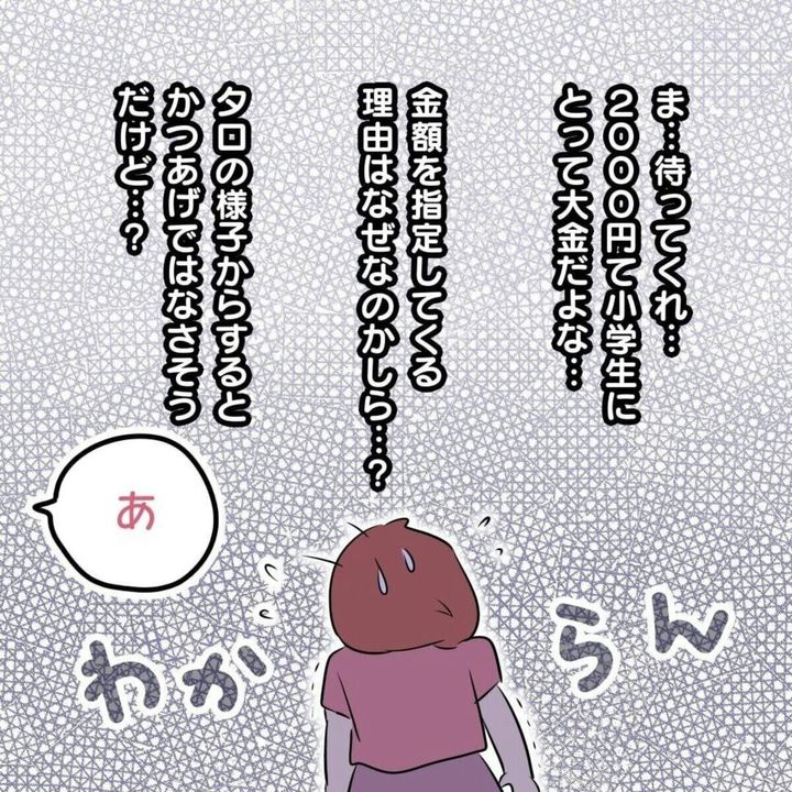 皆さんはわが子にお金の話をしていますか?お小遣いの導入時期や、子どもがお金に関心を持つ時期はそれぞれですよね。悪気がなく、ちょっとしたお金の貸し借りや「おごる」「おごられる」という行為を知らない親のところでされていたら、皆さんはどうしますか?今回ご紹介するお話は、子どもが悪気なく起こしてしまった金銭トラブルについて描いています。星河ばよ(@bayo_fantasy)さんの作品『2000円持ってきてね』をご覧ください。