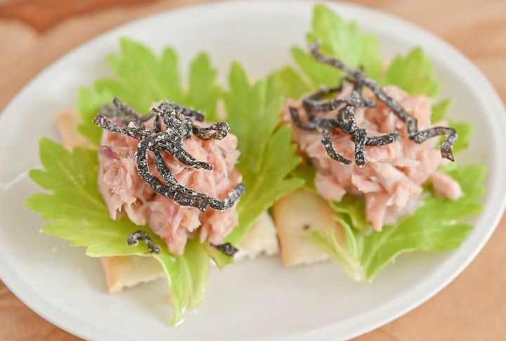 (2)クラッカーの上にセロリの葉、ツナ缶、塩こんぶを半量ずつのせて完成。