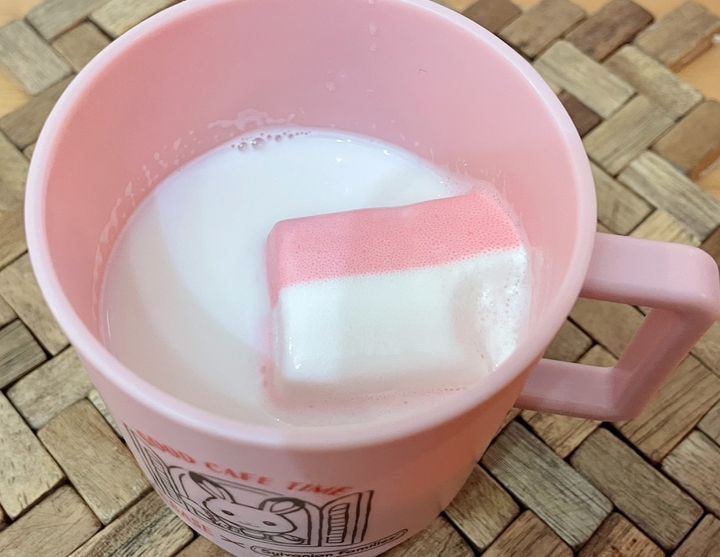 ピンクと白色の苺味のマシュマロは、見た目の可愛さと「温かいミルクに混ぜるといちごミルクのように」とお店のポップに書いてあったので気になって購入。ミルクに3粒いれてみると良い甘さでした♪