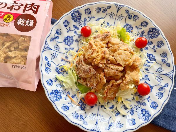 新形状のスライスタイプは、醤油、にんにくなどで味つけをしてから揚げ風にして、サラダのトッピングにしました。たんぱく質がプラスされるので、栄養バランスが上がって、一皿で満足感があります。