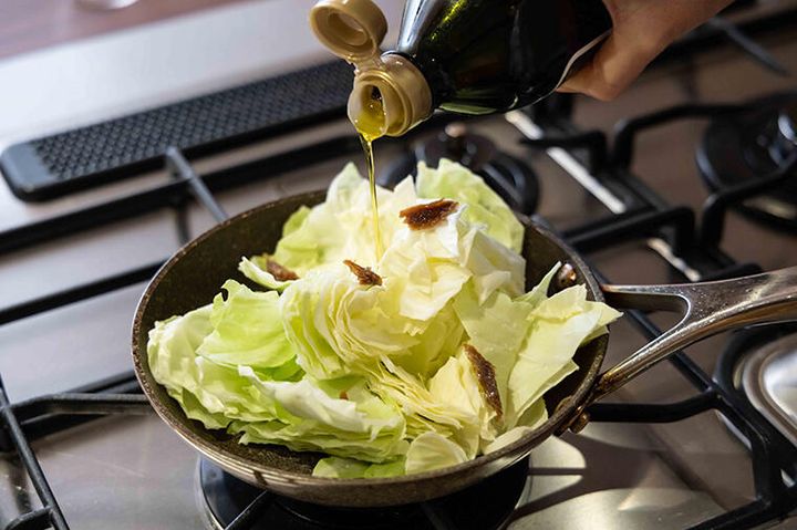 □大原千鶴さんの“アンチョビキャベツのオイル蒸し”