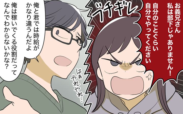 ・この義兄は論外ですが、自分の意見を言えない勘違いDV野郎とモラハラ義母とは絶縁一択。行くところがなくて世話になっているのに命令とかありえない。