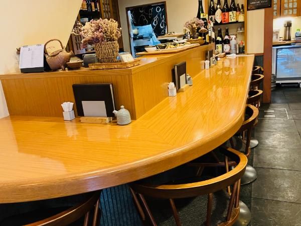 店内はカウンターが6席、お座敷にはテーブルが3卓。落ち着いた雰囲気で居心地の良い空間です。夜は居酒屋なのでお酒のボトルもたくさん並んでいます。
