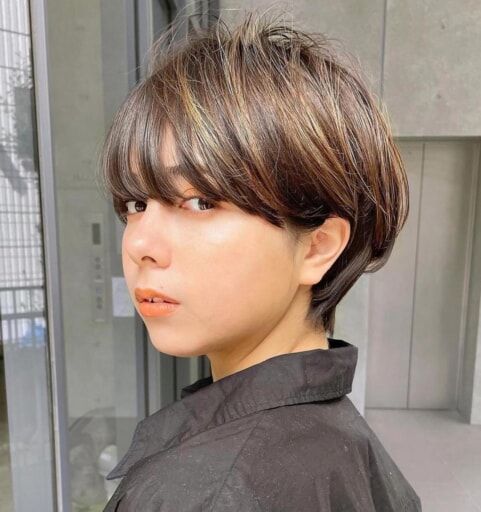 “長め前髪×丸みシルエット”のショートヘアはシルエットをコンパクトに見せることができて小顔効果大。顔の大きさを相対的に小さく見せるために、輪郭に合わせてトップのボリューム感を調整することがポイントです。また、「輪郭の弱点をカバーしている」という印象を与えないように、あくまでナチュラルな仕上げにこだわりましょう。