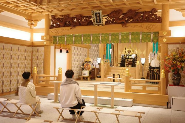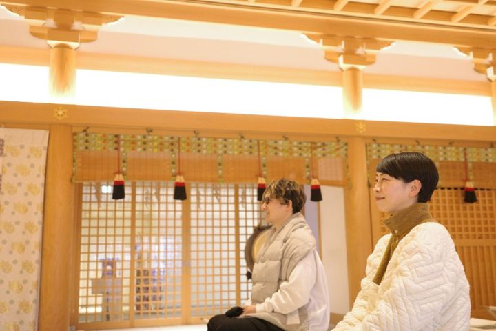 今回は特別に社殿に入らせていただき、しばしメディテーション。約3年かけて御造替(ごぞうたい)を行い、2016年に竣工した社殿は、宮大工の伝統的な技術がそこかしこに! (ちなみに、御造替とは社殿の位置を変えずに修復することです)   仁田 「わあ〜! 私、美しく修復された社殿を見ると、どこの会社が施工したか聞きたくなるタイプ(笑)。水天宮の境内も社殿も、本当に美しい! 伝統技術と現代的なデザインが絶妙に融合しています」