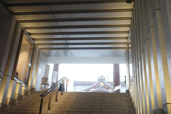 福めぐり3回目も前回同様に雨! さすが、水の気が強いyujiさんです。こうなったら、毎回の天気が楽しみになってきました。開口一番「いつも雨ですみません」と謝ってくださるyujiさんにほっこりする福めぐり一行。   さて、境内に入る前に息を呑むのが、美しいエントランス。まるで美術館のような入り口です。   yuji 「これは異世界へのゲートそのもの。くぐった先の境内は、外の街の喧騒とは無縁の世界です」   仁田 「屋根のある階段を上がった先に神社があるのも、なんだか舞台のような構造です」   yuji 「まさに、自分が主役になれるような神社ですね」