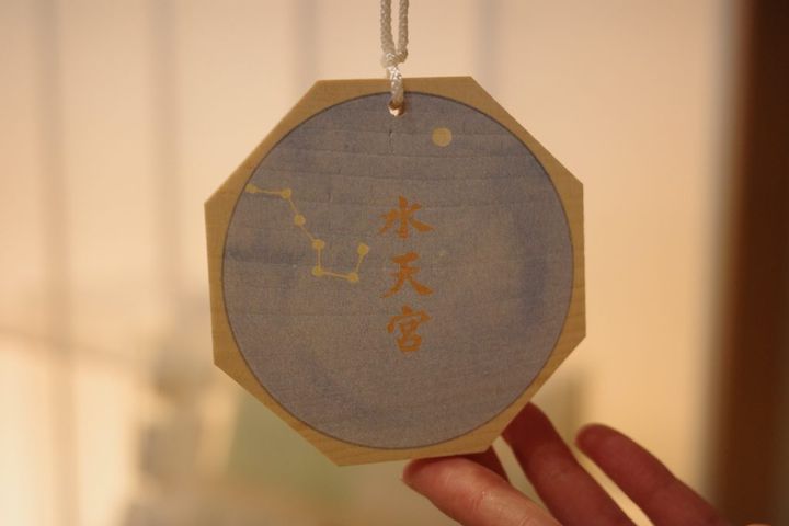 仁田 「社務所で発見した絵馬の裏には、北極星と北斗七星が描かれています! かわいいですね」   yuji 「北極星信仰の神社は少ないので、珍しいですね。北極星は動かない中心の星です。ブレブレな自分の軸を、正しいところに定めたい人にもいいと思いますよ」
