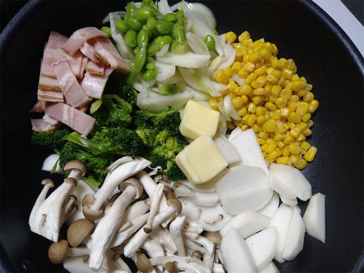 3.熱したフライパンに12ととうもろこし、さやから取り出した枝豆を入れ、バターを加えてしんなりするまで炒めます。