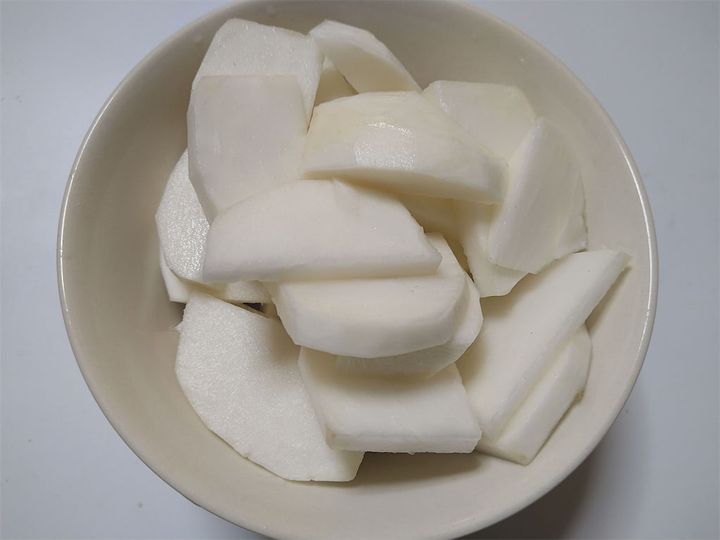 1.かぶの葉を落として皮をむき、やや厚めのいちょう切りにします。ブロッコリーは食べやすい大きさの小房に切り、ラップをかけて共に600Wの電子レンジで2分程度加熱します。