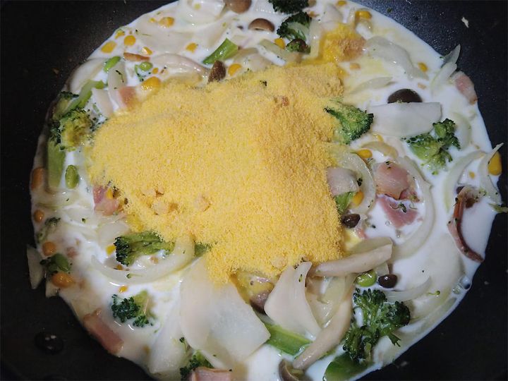 4.野菜に火が通ったら、牛乳とコーンスープの素を入れてよく混ぜて煮込みます。