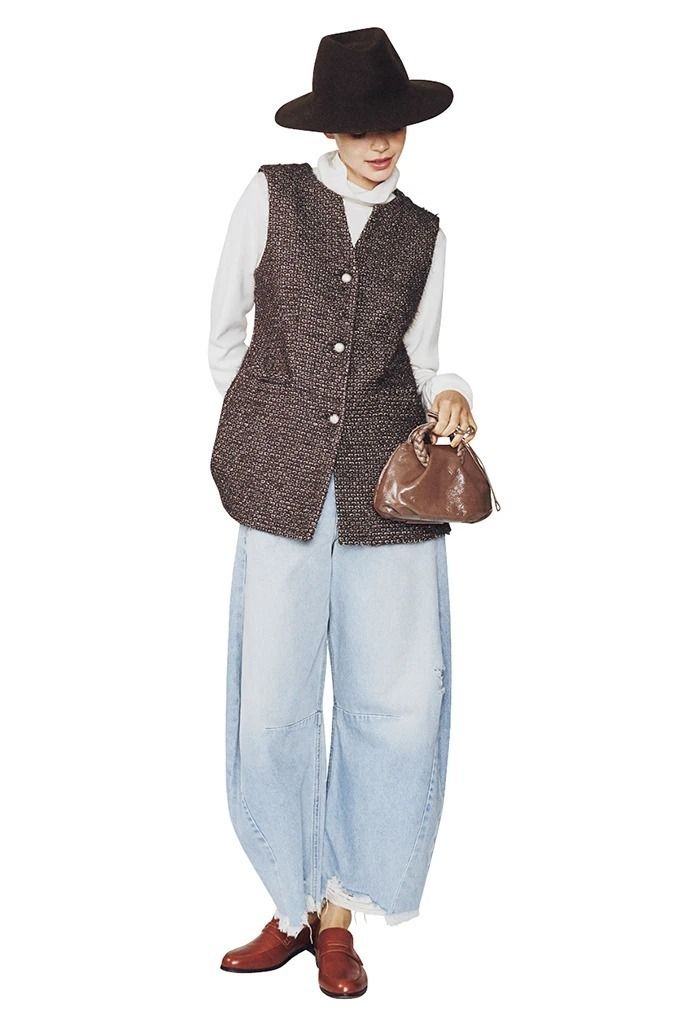茶ツイードベスト 63,800円/ドローイングナンバーズ(ドローイングナンバーズ 新宿店) 白タートルカットソー 25,300円/R.H. Vintage(ロンハーマン) ブルーデニムパンツ 51,700円/シチズンズ・オブ・ヒューマニティ、茶ハット 12,100円/ソルバッティ(ともにアルアバイル) 茶ハンドバッグ 56,100円/ヘリュー(ショールーム セッション) 茶ローファー 16,390円/A de Vivre