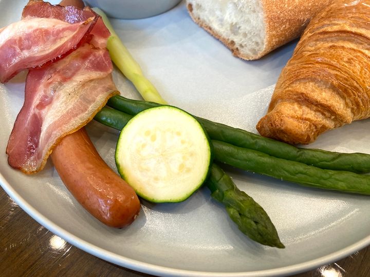 ベーコンとソーセージは東京・台東区にある「浅草ハム」のものです。ベーコンはちょうどいい塩気で、濃い肉の味を堪能することができます。ソーセージはひと口食べるとパキッとした食感とともに、中からジュワッと肉汁が出てきます。癖になる味で、やみつきになること間違いなしです!