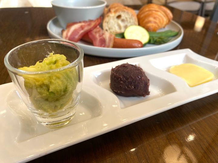 「アボカドディップ」「あんこ」「パンプリーバター」の3種類のコンディメントもセットになっているのでお好みでパンに付けてみて。どれもパンとの相性は抜群ですが、なかでもおすすめのあんこは、昭和27年(1952)創業の「望月製餡所」のこしあんで、上品な甘さが特徴です。ぜいたくな付け合わせに朝から幸せな気分になれました!