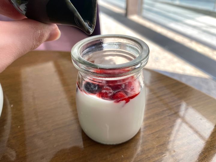 ヨーグルトはとろりとなめらかな食感が魅力。そのままでもおいしいですが、イチゴの果肉が入ったソースをかけるのがおすすめです。酸味と甘みのバランスがよく、スプーンを動かす手が止まりません!