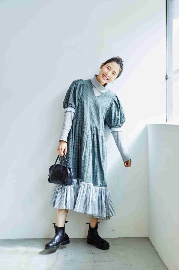 コーデの主役は、ボリュームのあるシルエットがロマンティックな「花びら」のワンピース。「女性が一人でやっているハンドメイドブランドのものです。少しカーテンっぽいような柄に、ストライプのフリルがついていて、柄の組み合わせもユニーク。今回はインにビワコットンのタートルを合わせましたが、あたたかくなってきたら1枚でも着たりと、1年中着られるのがいいですね」
