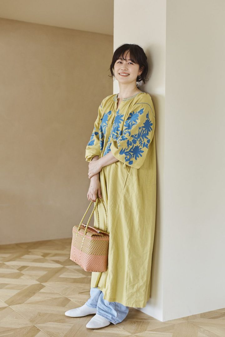 ビタミンカラーにパッと目を引く青い刺繍が施されたワンピースをまとった高松さん。ワンピースはヌキテパ Sara mallika。さらりとした肌触りで風通しのよいコットンリネンは、速乾性があるので暑い日にもぴったりです。ボトムスと靴を涼し気な色でまとめて、爽やかな大人カジュアルコーデに。
