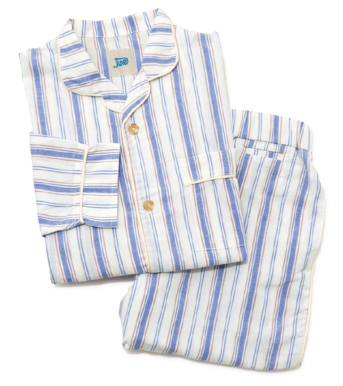 構想から1年半かけて誕生した『ジューン』のパジャマセット。デッドストックのストライプ生地を使い、どこか懐かしい雰囲気に。ワンマイルウェアにもなるラフすぎない絶妙なラインが魅力。¥33,000(モットハウス・トーキョー TEL:03・6325・2593)